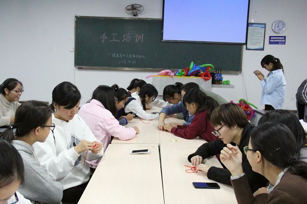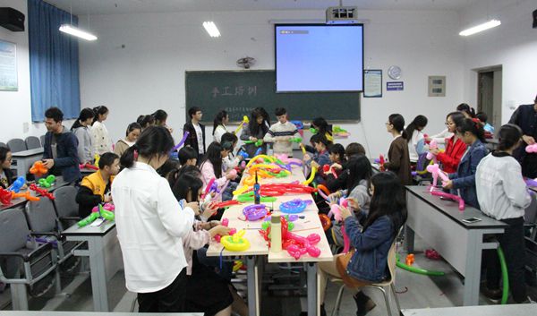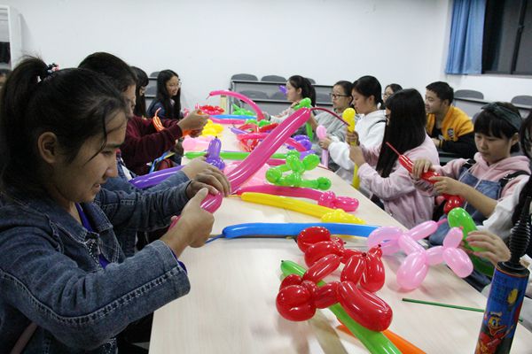 首先,由王平同学教志愿者们折气球。王平给志愿者展示了颜色各异、形状多样的气球,极大地调动了大家的好奇心和积极性,并现场示范具体操作步骤,志愿者们自告奋勇地主动手折气球,气氛十分活跃。