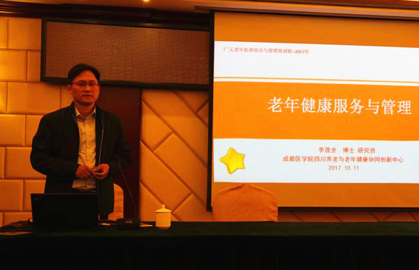 10月9日-12日,成都医学院、广元市卫计委、广元市中医药管理局在广元市联合举办“老年医养结合与管理培训班”。本次培训班由成都医学院四川养老与老年健康协同创新中心主办,广元市卫生计生委、中国老年医学学会院校教育分会、中国老年保健医学研究会老年健康服务人才培养分会、四川省老年医学学会健康养老与医养结合专委会共同承办。长江学者、北京大学第三医院汪涛教授等相关专家受邀授课。
