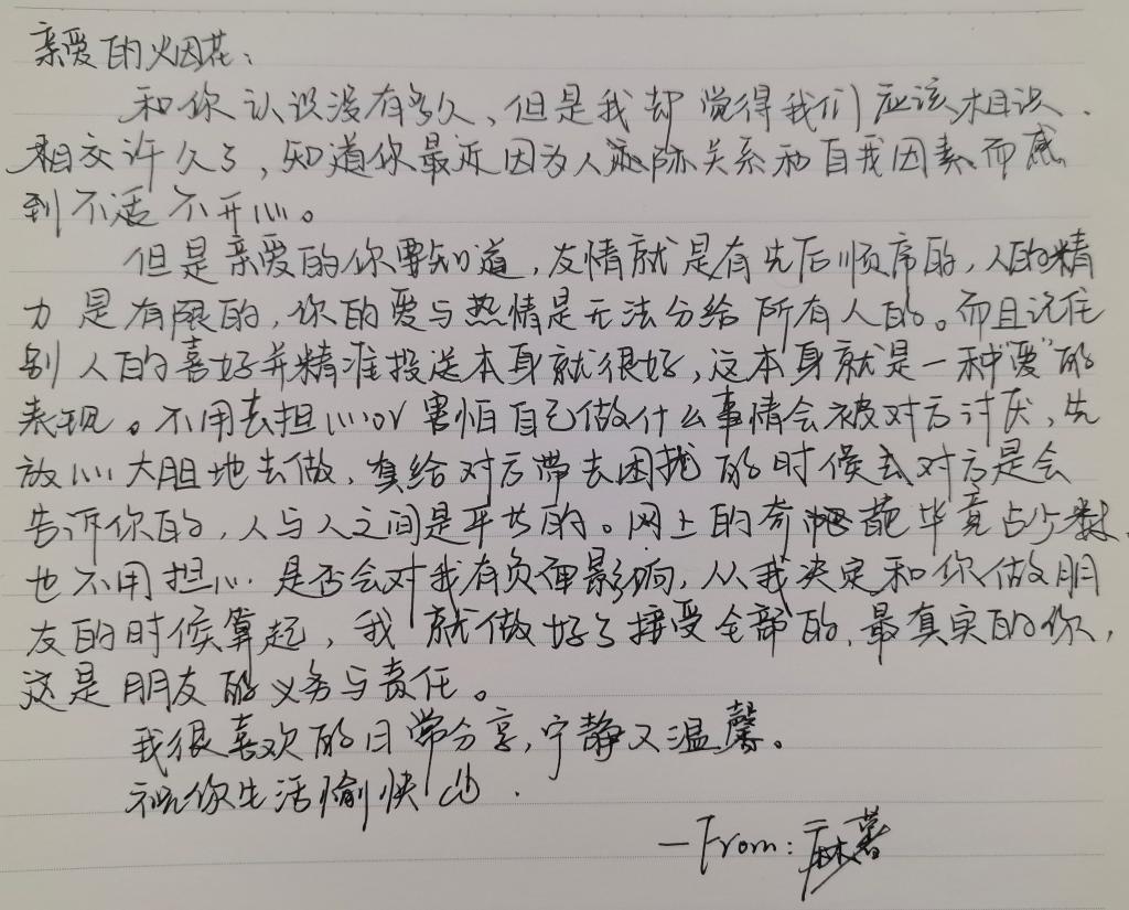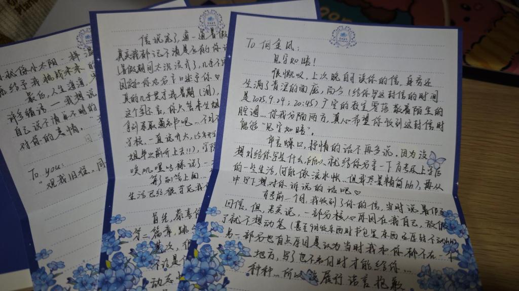 活动期间,线上QQ群成为情感与创意碰撞的天地。参与的同学围绕“友情”与“秋分”的主题,以手写信为载体,将藏在心底的牵挂、近期的生活点滴与真挚祝福落于笔尖:有的同学特意挑选秋日落叶夹在信中,让“拾叶为签”的主题具象化,金黄的叶片与墨色字迹相映成趣;有的写下与挚友共度的校园秋日回忆——“记得去年秋分我们一起在操场捡银杏,今年虽不在同一地方,却想把这份秋意随信寄给你”;还有的借书信梳理心绪,将学业忙碌中的疲惫转化为对彼此的鼓励,字句间满是真诚。