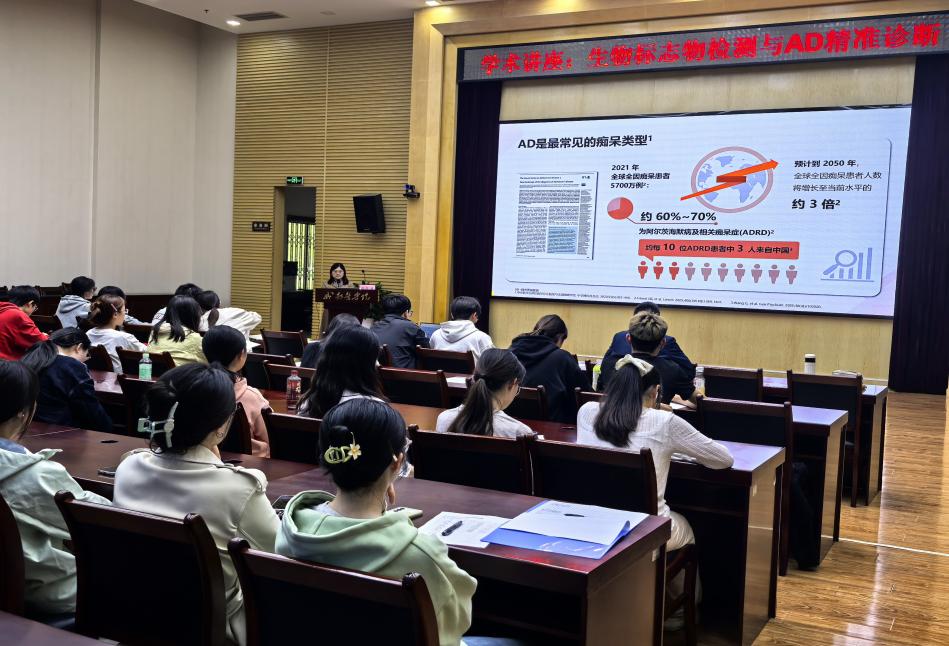 邹显巍教授以《生物标志物检测与AD精准诊断》为主题,结合自身丰富的临床与研究经验,进行了一场内容详实、前沿专业的学术分享。讲座深入剖析了阿尔茨海默病(AD)这一最常见的痴呆类型所面临的严峻挑战,围绕AD诊断现状的痛点与破局关键展开,系统介绍了生物标志物在揭示AD核心病理中的关键角色,并为在场师生梳理了AD生物标志物的发展脉络与应用前景。