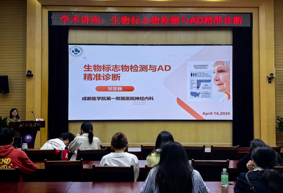 2026年4月16日,成都医学院老年健康学院、智慧医养与老年健康管理重点实验室在多功能厅举办了“生物标志物检测和AD精准诊断”学术讲座。本次报告会特邀成都医学院第一附属医院神经内科主任医师邹显巍教授担任主讲嘉宾。学院教师、在校学生等50余人参加了此次讲座。